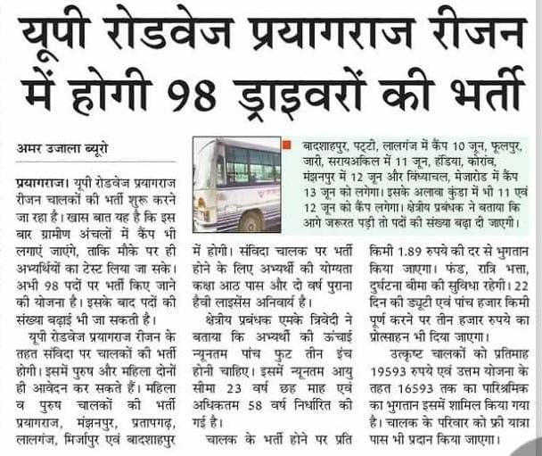 अच्छी खबर !! रोडवेज में रोजगार का मौका – परिवहन निगम में संविदा पर 98 चालकों की भर्ती के लिए प्रयागराज रीजन में आवेदन मांगे गए हैं। प्रशासन की तरफ से हेल्पलाइन नंबर 9792746532 जारी किया गया है। सरकार ने संविदा रोडवेज चालकों और परिचालकों का वेतन मानदेय 1060 रुपये प्रति महीने बढ़ा दिया है। न्यूनतम शैक्षिक योग्यता आठवीं पास है। यूपी सरकार रोडवेज ड्राइवरों को वर्दी के लिए 1800 रुपये देगी, वर्दी नहीं पहनने पर 50 रूपए का जुर्माना लगेगा। इच्छुक उम्मीदवार डिपो जाकर आवेदन कर सकते हैं।